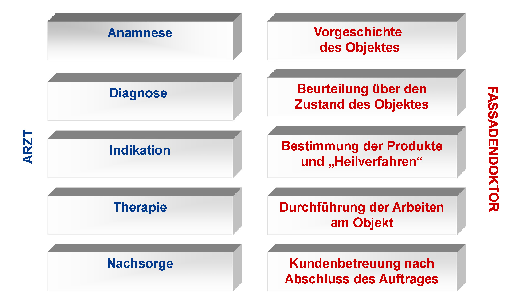Der Fassadendoktor ist dazu der begleitende Sammelbegriff bzw. das Motto, denn vom Fachhandwerker erwartet der Kunde und Auftraggeber täglich, dass er nach einem kurzen Gespräch – meist sogar noch fernmündlich – eine gezielte Diagnose vom Krankheitsbild der Fassade stellt. Die Erwartungshaltung der Hausbesitzer zwingt Industrie und Fachhandwerk gemeinsam, marketingtechnisch zu reagieren.